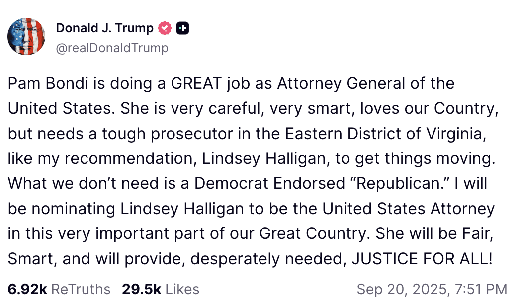 Confusingly, Trump claims to have both “nominated” Halligan and “appointed” her as US Attorney for EDVA, making it unclear if he intends to “get things moving” imminently by installing her in office now.