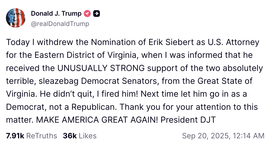 On Friday, Erik Siebert, the US Attorney for the Eastern District of Virginia (EDVA), resigned his office. Trump had been grumbling for weeks about “his” US Attorneys refusing to indict his political enemies. And that’s even after Bill Pulte, head of the Federal Housing Finance Agency, went spelunking through decades of mortgage records looking for any discrepancy that might be spun up into a federal case against people who were mean to Trump. Unfair!