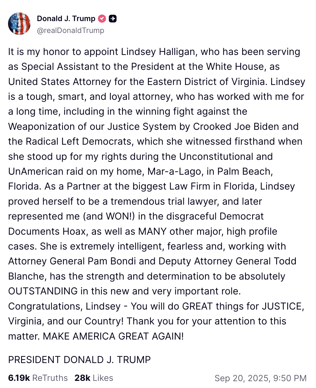 Confusingly, Trump claims to have both “nominated” Halligan and “appointed” her as US Attorney for EDVA, making it unclear if he intends to “get things moving” imminently by installing her in office now.