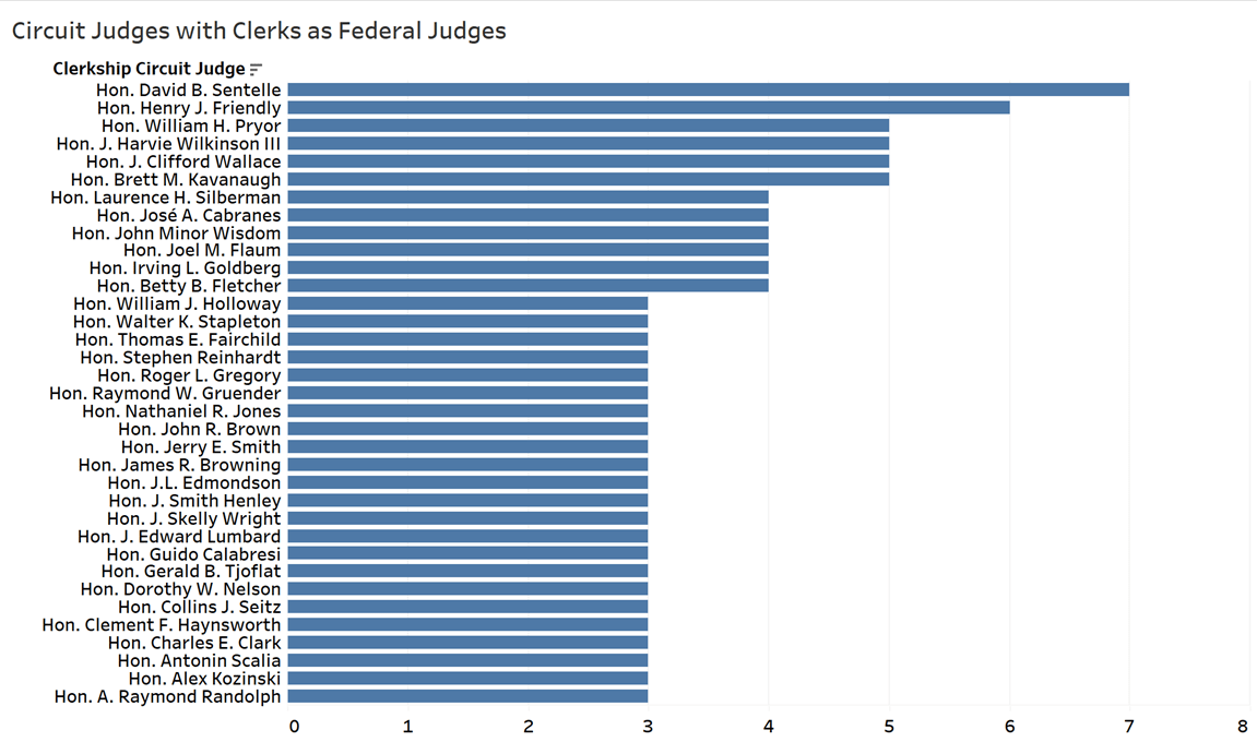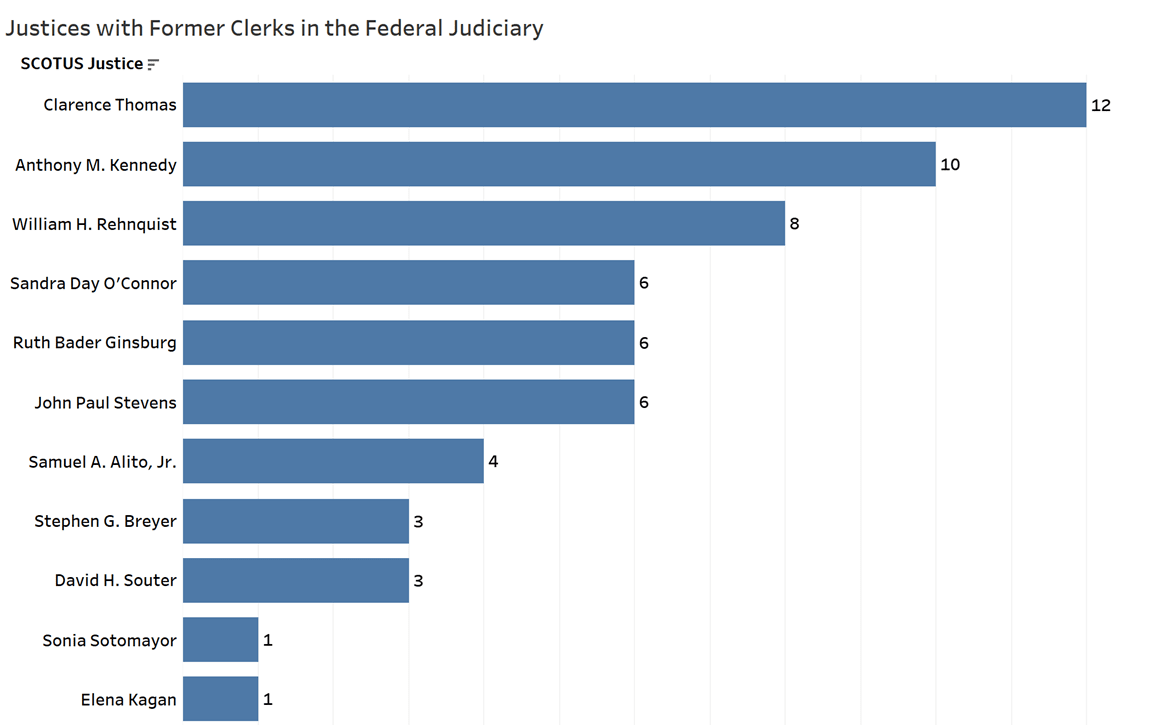 Fourth, the concentration visible in these numbers—particularly Justice Thomas’s twelve clerk-judges and Judge Sentelle’s seven—suggests that a relatively small number of judges are having outsized influence on the composition of the federal bench. This has the effect of concentrating enormous power in the hands of a few individuals to shape the judiciary’s future direction, particularly when combined with ideologically motivated appointment processes.