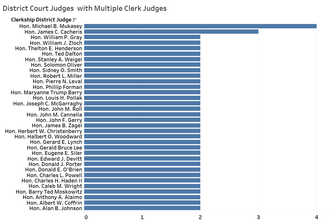 The data reveals a more dispersed pattern than at the circuit or Supreme Court levels. Judge Michael B. Mukasey of the Southern District of New York leads with four former clerks in the federal judiciary—an impressive figure given that district judges typically have fewer clerks and less name recognition than their appellate counterparts. Judge James C. Cacheris of the Eastern District of Virginia follows with three clerk-judges, while numerous other district judges have placed two former clerks.