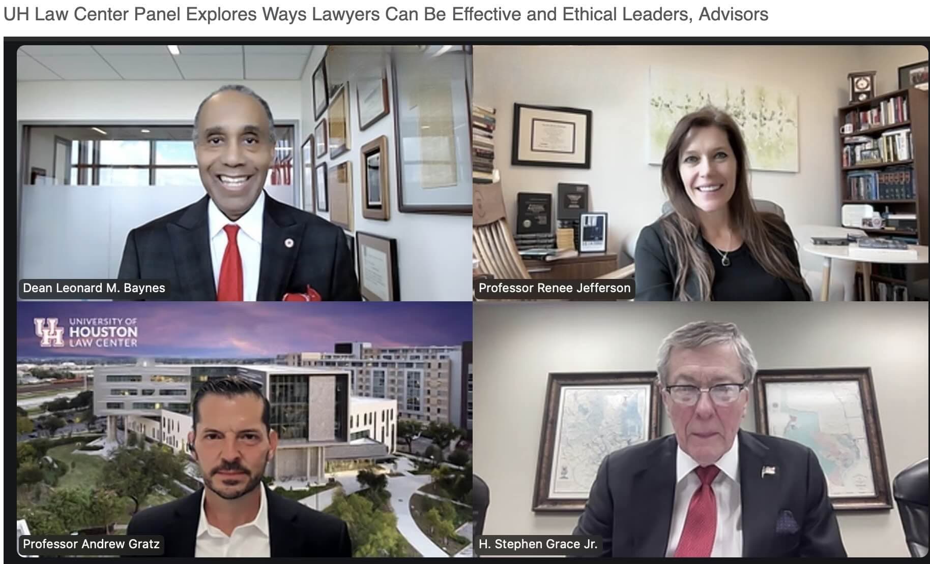 #10 “UH Law Center Panel Explores Ways Lawyers Can Be Effective and Ethical Leaders, Advisors.” From the University of Houston: “Lawyers play pivotal roles across the wide spectrum of American centers of power – from the White House to local governments, from corporate boardrooms to nonprofit organizations. A recent online webinar hosted by the University of Houston Law Center, ‘Lawyers Who Lead: Ethics, Influence, and Impact,’ examined the significant influence lawyers can hold and how to exercise it responsibly.” Read more and watch here.