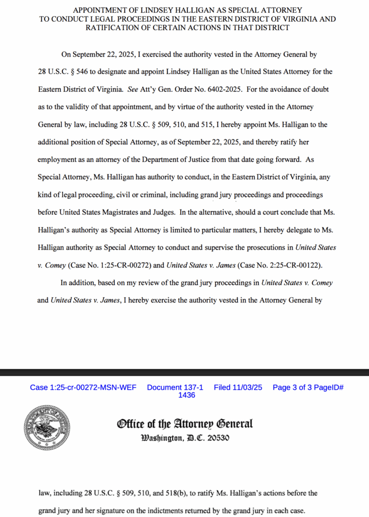 Pam Bondi is currently trying to do the three-hat dance in reverse. After Comey and James filed motions to dismiss noting that three courts have found that the president cannot make successive interim appointments, Bondi signed a new order purporting to retroactively designate Halligan as a special attorney under §§ 509, 510, and 515 “as of September 22” — effectively traveling back in time six weeks and sticking the third hat on Halligan before she secured the indictments.