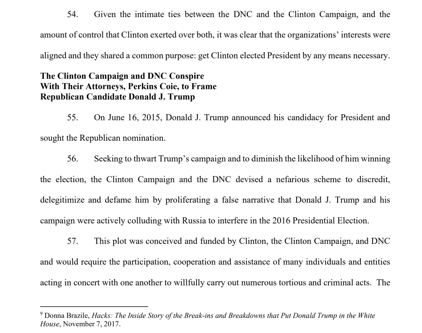 As the predicate crime for civil RICO, it alleged “theft of trade secrets,” by which Habba and Ticktin meant recording internet traffic from servers in Trump Tower — something which is neither trade, nor a secret. Trump purported to sue government officials in their individual capacities for actions taken on the job, later adding his own deputy attorney general Rod Rosenstein as a defendant. His lawyers shrugged off the statute of limitations by claiming that Trump was entitled to an extension because he worked harder than any other president and didn’t have time to sue for two full years after leaving office. They falsely asserted that one of the defendants, Charles Dolan, was a former chairman of the DNC. And they left-justified the subheadings!