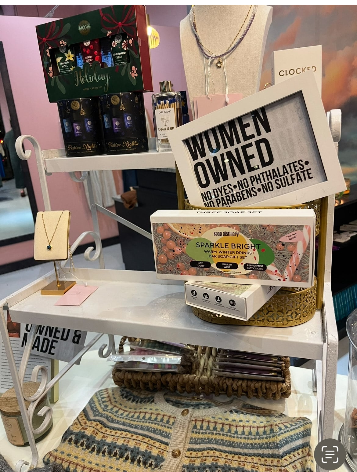 I interviewed Markham at Jurisdiction, which gave me a firsthand look at the boutique’s jam-packed collection of distinctive clothing — items rarely found in chain stores — and the surprisingly wide selection for such a small shop. The space is also stuffed with accessories purchased from women-owned brands and other unique gift items. The store had several customers while I was there and I watched as Andi, the store manager, skillfully offered personalized feedback and suggestions to them. The store features a neon sign, “We are all beautiful,” which Markham said reflects the store’s philosophy.