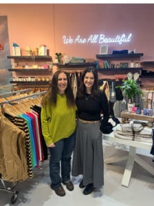 I interviewed Markham at Jurisdiction, which gave me a firsthand look at the boutique’s jam-packed collection of distinctive clothing — items rarely found in chain stores — and the surprisingly wide selection for such a small shop. The space is also stuffed with accessories purchased from women-owned brands and other unique gift items. The store had several customers while I was there and I watched as Andi, the store manager, skillfully offered personalized feedback and suggestions to them. The store features a neon sign, “We are all beautiful,” which Markham said reflects the store’s philosophy.
