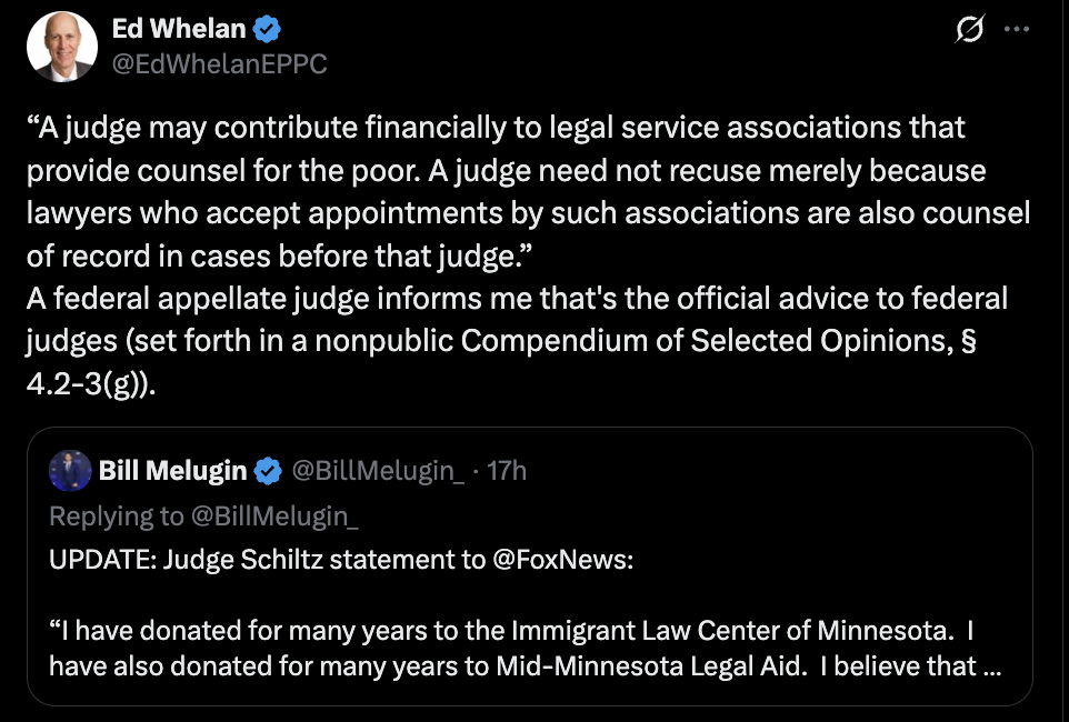 That should be the end of it, but it’s 2026 so it definitely wouldn’t be. Conservatives continued sounding off that Schlitz was presumptively unfit because he donates to charities. Whelan, a fellow Scalia clerk, jumped in to explain to the masses that his insider sources tell him that the federal judiciary’s own rules would consider Schlitz’s donations ethically irrelevant: