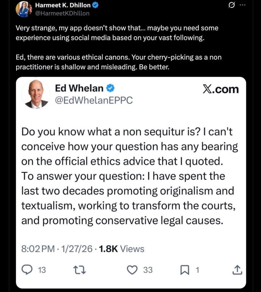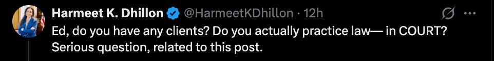 And successful too… at least with the conservative audience for this conversation. The replies just mindlessly parrot Dhillon. “You’re acting like a grown up ‘lawyer’ without actually having been one in practice,” one writes, apparently without investing the 10 seconds required to look Ed up on Wikipedia. “Ed failed Ethics Class in his on line law school,” writes another. Presumably a Yalie.