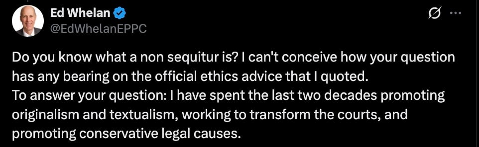 Yes, her response has no bearing on the ethical rule. That should be the end of the post. Having apparently never heard the old saw, “better to remain silent and be thought a fool than to speak and remove all doubt,” Whelan continued. “I have spent the last two decades promoting originalism and textualism, working to transform the courts, and promoting conservative legal causes.” Defying all odds, he managed to make himself sound less credible. Dude, you worked for the Justice Department too. Just say that! “Well, I have spent 20 years attending parties and peddling disingenuous readings of obscure 19th century pamphlets” is not getting the job done.