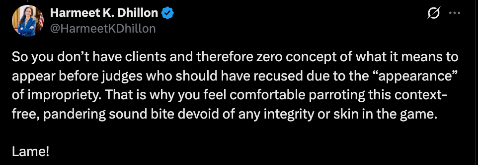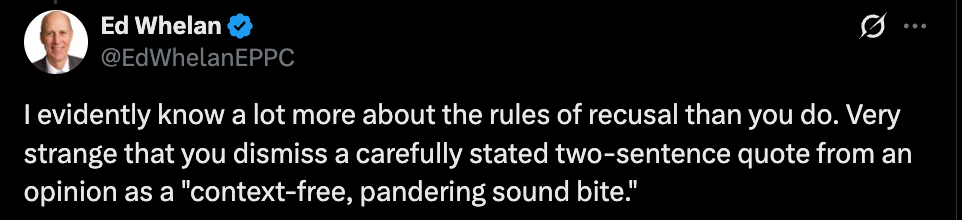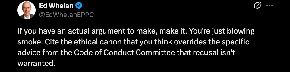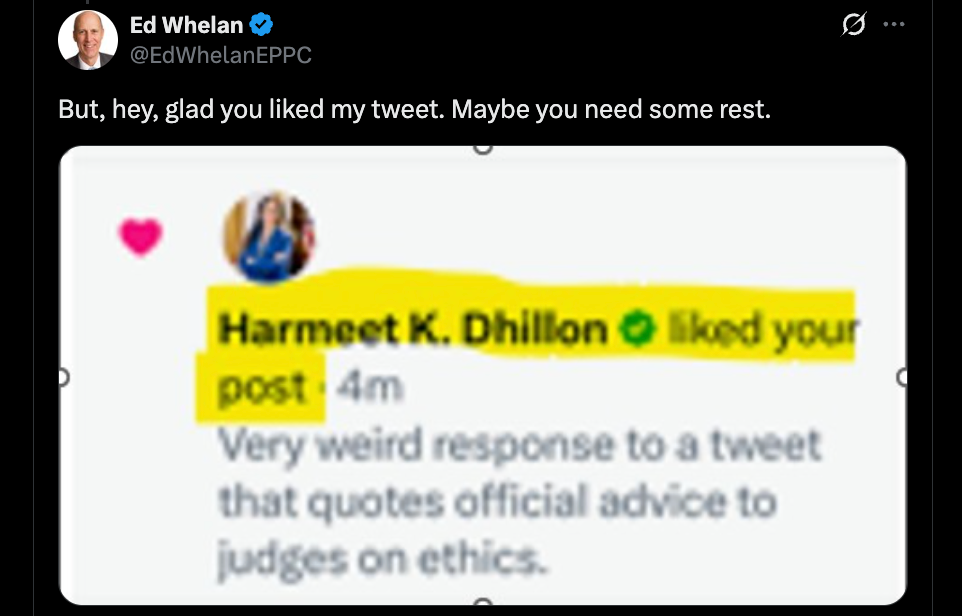 Yes. You cannot say, “there are various ethical canons” and then not cite any that contradict. But to play devil’s advocate for Dhillon — who finally stopped posting after this… or maybe passed out — the official advice that Whelan cited only says a judge need not recuse “merely” by virtue of making a donation. So, not to get all “textualist,” but it is not dispositive. If a donation that would otherwise be acceptable reasonably creates an appearance of bias, then a judge may find it more prudent to recuse themselves anyway. Nothing about the quoted text directly contradicts that. The Fox News drums and the bleating in the replies signals that there’s a sizable population out there who think this at least creates an appearance of bias.