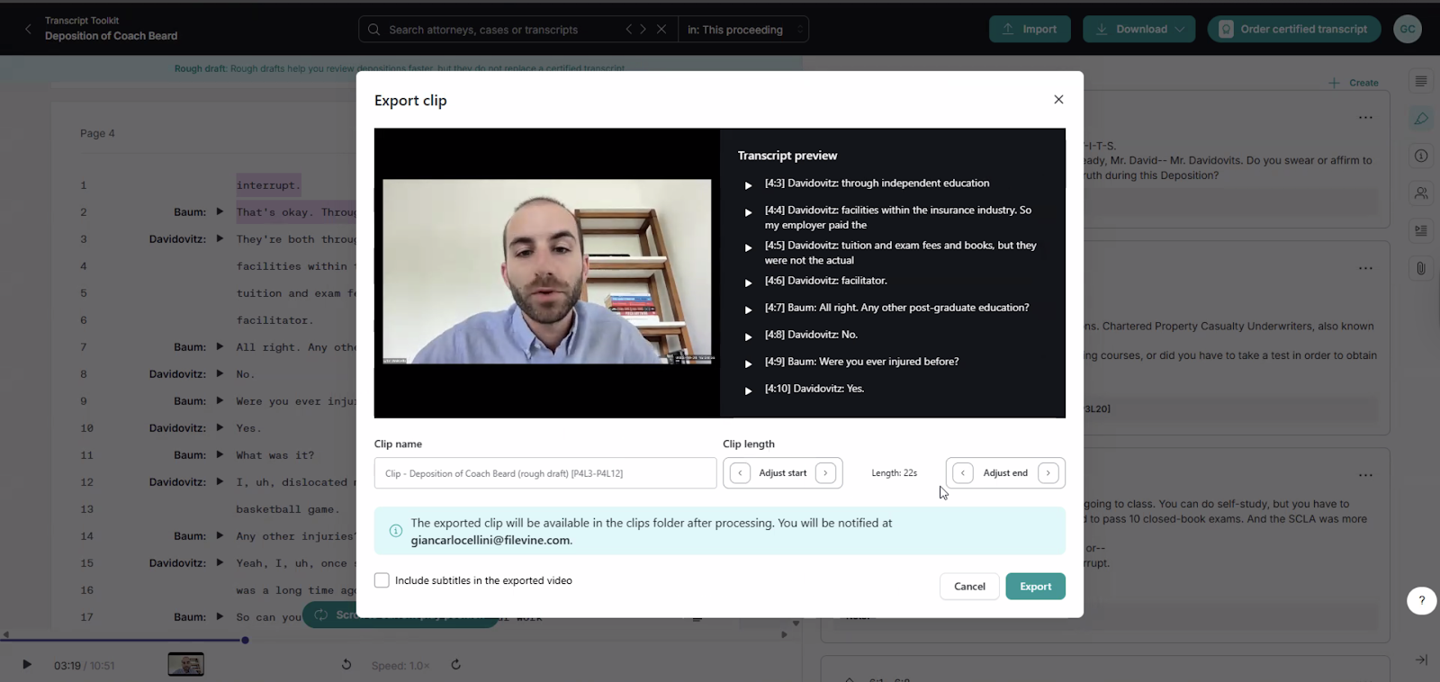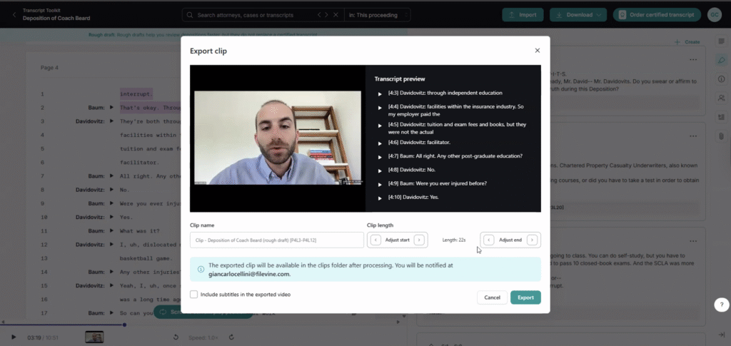 An exhibits folder embedded in the case can be shared with the court reporter, and a video clips folder will help organize the most relevant portions of the proceedings.