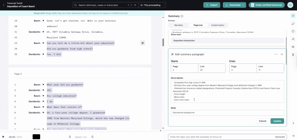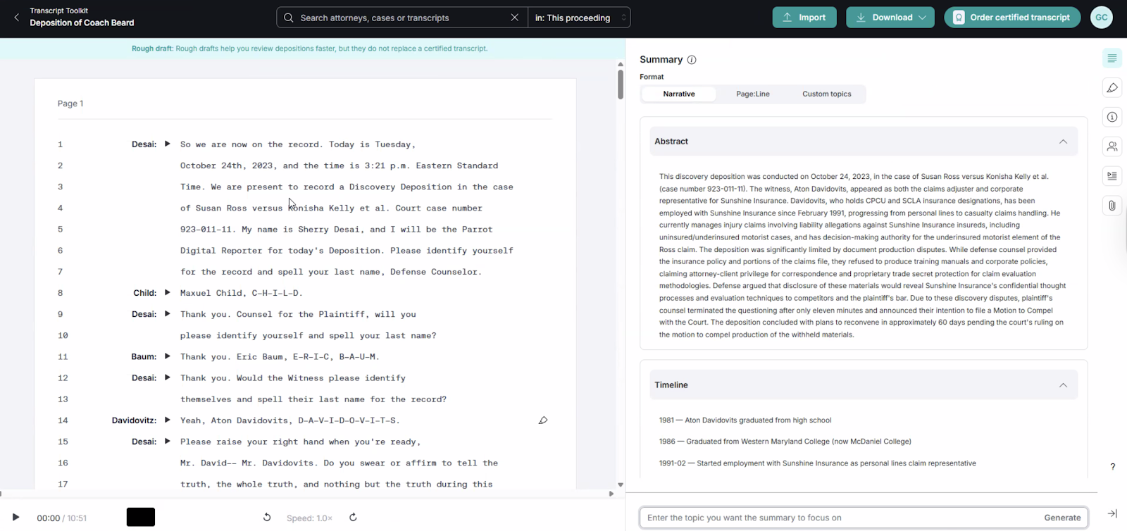 As soon as a deposition concludes, the AI gets to work. A video-synced rough draft transcript appears (generally) within one business day. Included with the rough draft, the AI uses the draft to generate an abstract, narrative summary and page-and-line summaries. It organizes the deposition into custom topics and syncs the audio and video to their location in the summaries.
