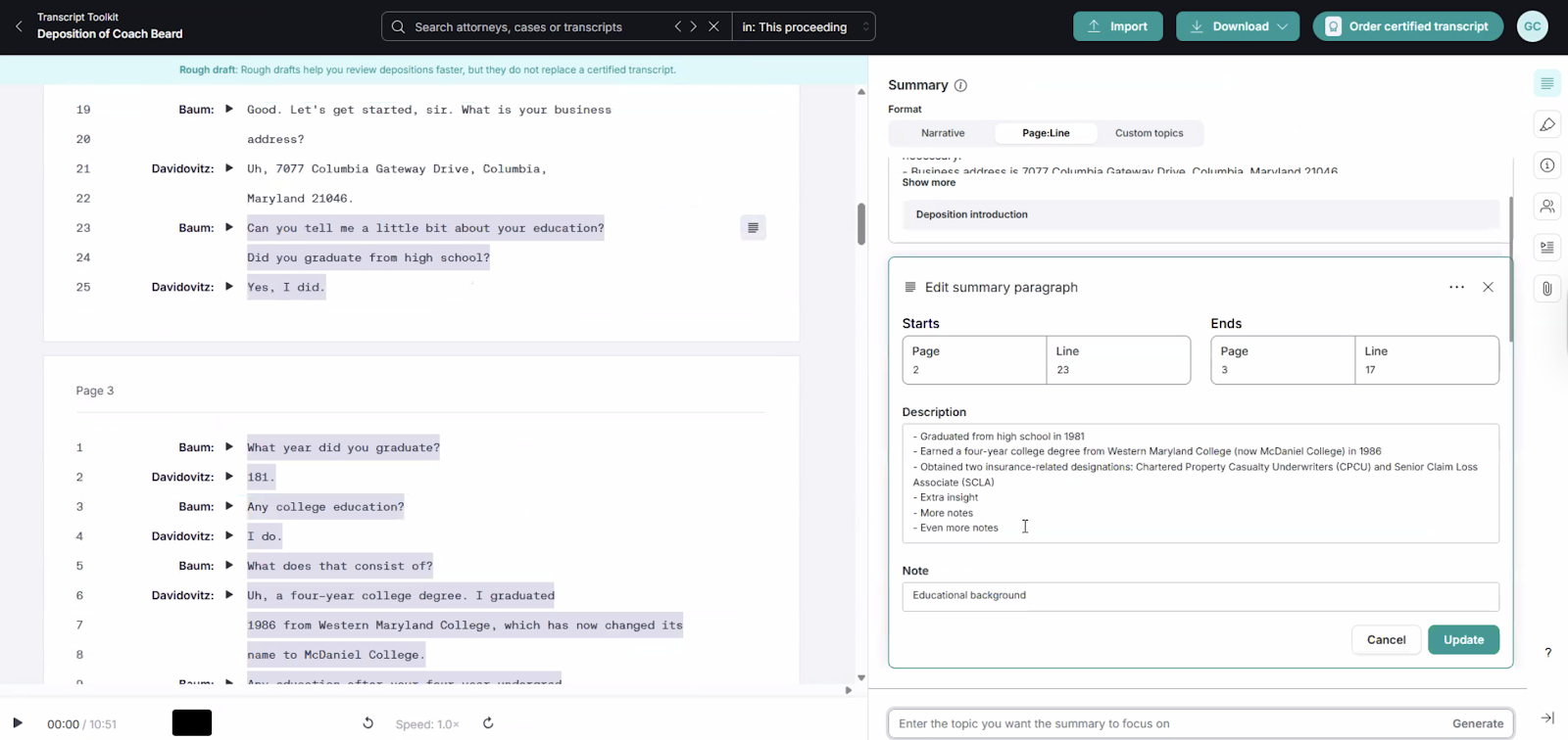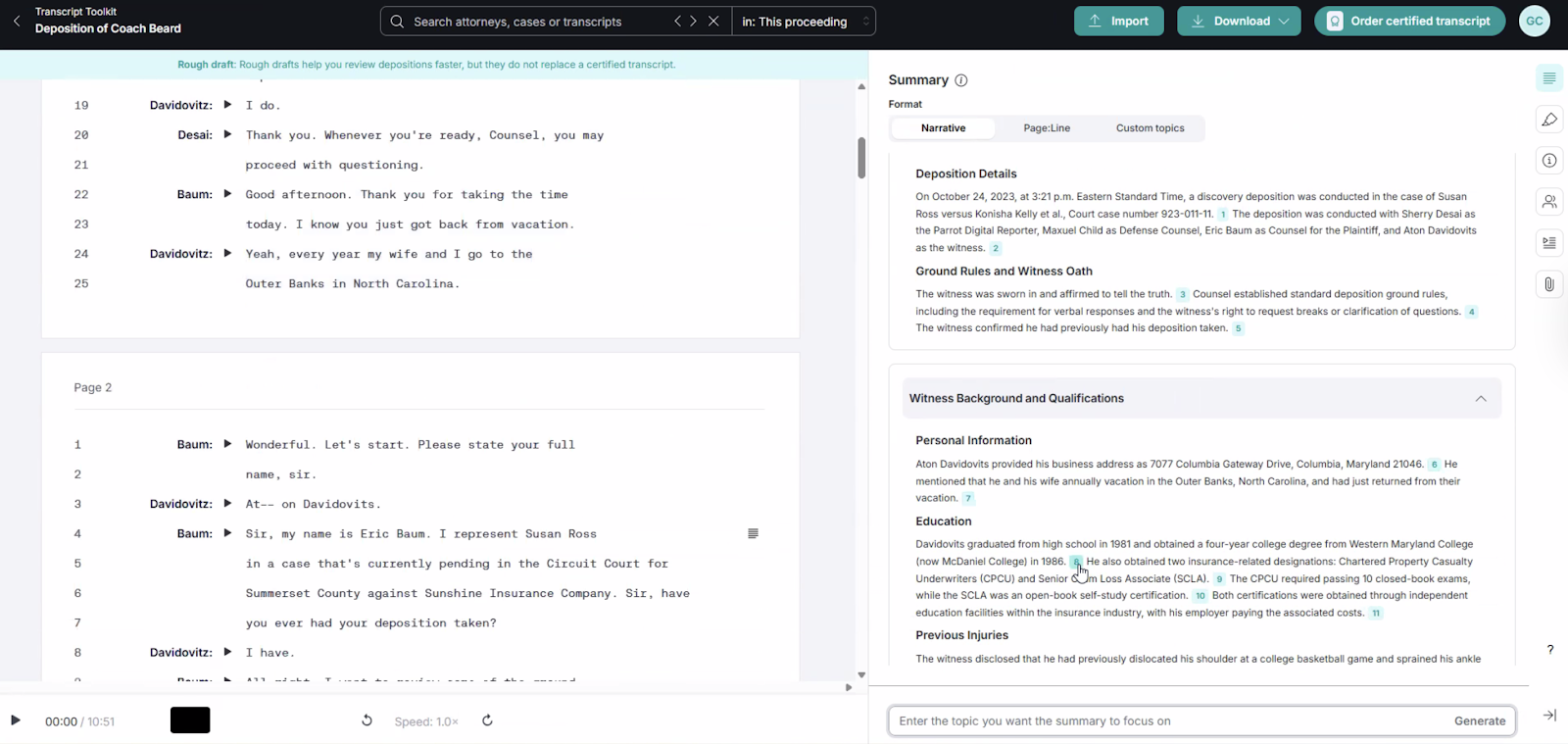 The narrative summary is organized by topics and subtopics, and every summarized statement includes a direct link back to the transcript, allowing attorneys to quickly verify the source material.