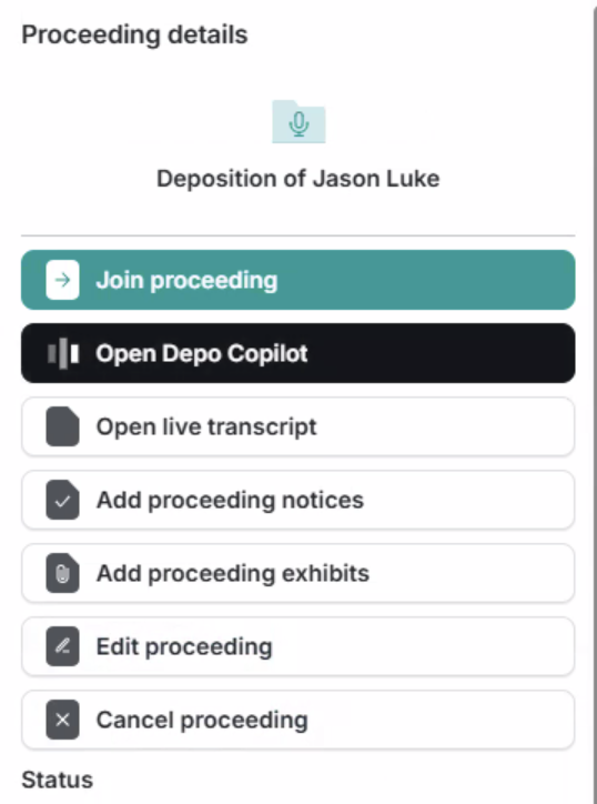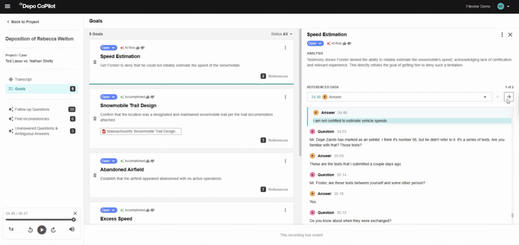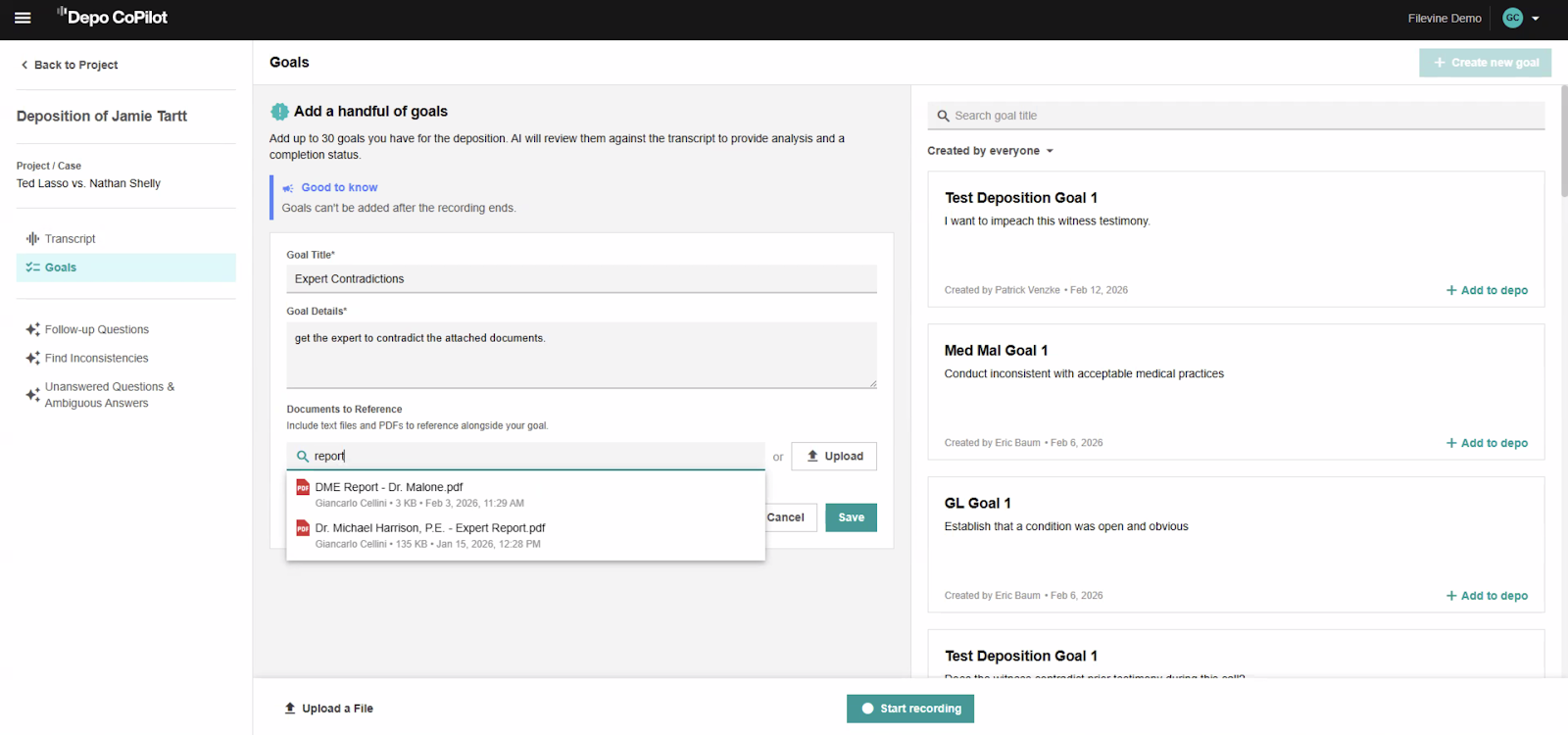 Before the deposition begins, lawyers can set the tool up like it’s an extra team member in the room — a feature called “AI Second Chair.” Depo CoPilot allows them to create goals for the proceeding and tracks them in real time.