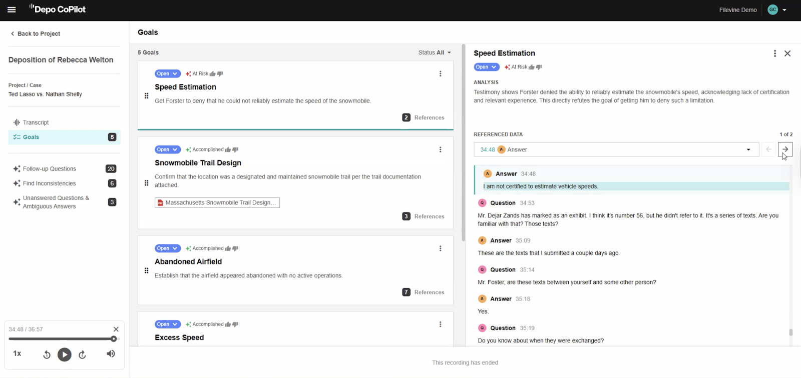 But the new Filevine Depositions and Depo CoPilot revolutionize the way depositions are taken. They help lawyers schedule depositions, set and track goals during them, draft summaries and timelines, and even prep for trial.