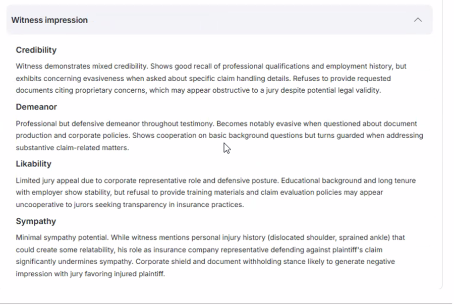 The software even analyzes witness demeanor and gives an assessment of credibility, likability and sympathy. Cellini noted that all kinds of attorneys from plaintiffs’ lawyers to insurance defense counsel have to write reports after every deposition with witness impression, but this tool gives an incredibly accurate head start.
