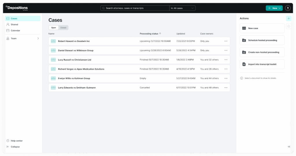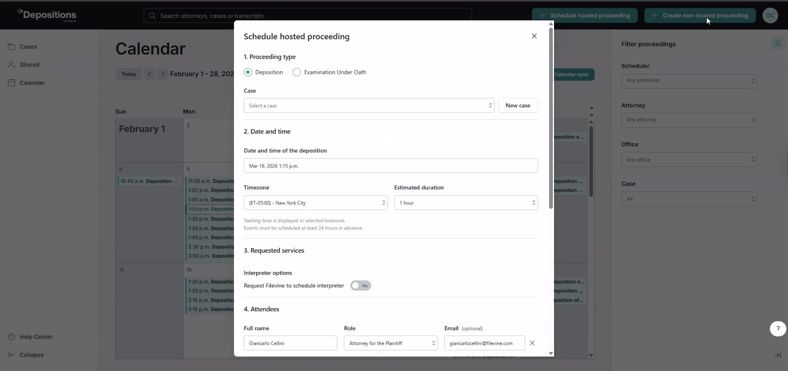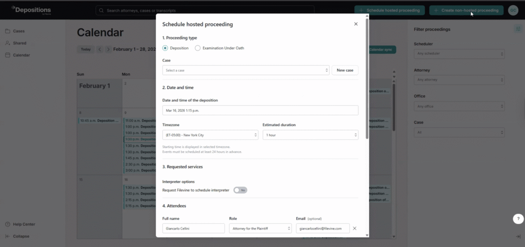 From the Depositions dashboard, users see all their cases and can easily schedule a proceeding in all 50 states and in federal jurisdictions. In states that require a certified court reporter, Filevine can help provide one. In other states, it schedules a person to digitally attend.
