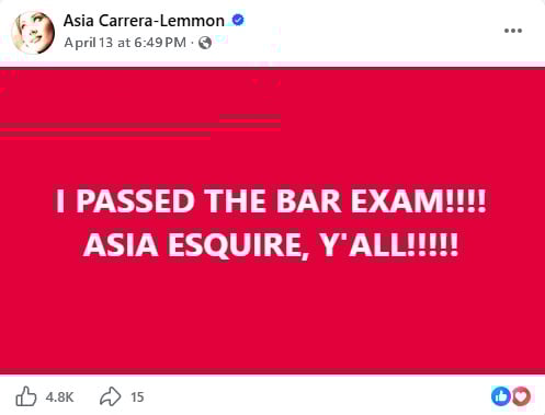Asia Carrera, a former pornography actress who graduated from St. Mary’s Law in 2024, just cleared one of the most notoriously miserable hurdles in the legal profession. Carrera — whose real name is Jessica Steinhauser — previously missed passing by just two points, but was able to turn it around during the February 2026 exam. For what it’s worth, according to TMZ, she has no desire to work as a lawyer, she “just wanted to prove she could pass the bar.”