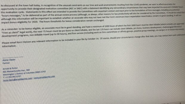 So, you might think that, given all these factors, if a Biglaw firm has billing thresholds to get year-end bonuses, they might loosen up some of those requirements in order to retain the best and brightest during this trying time — after all, not every firm even has these strict requirements. Well, when it comes to Arnold & Porter, welp, you’d be wrong.