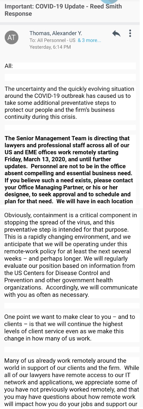 REED SMITH – CORONAVIRUS WORK-FROM-HOME POLICY