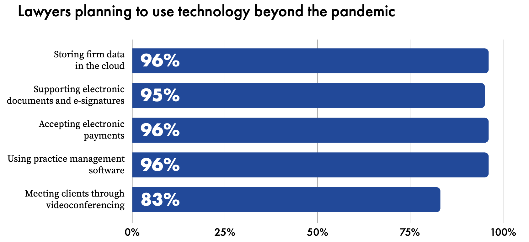 On the technology side, the report adds some hard data to back up what we’ve all heard anecdotally: the pandemic has made even the most tech-averse attorney commit to branching out.