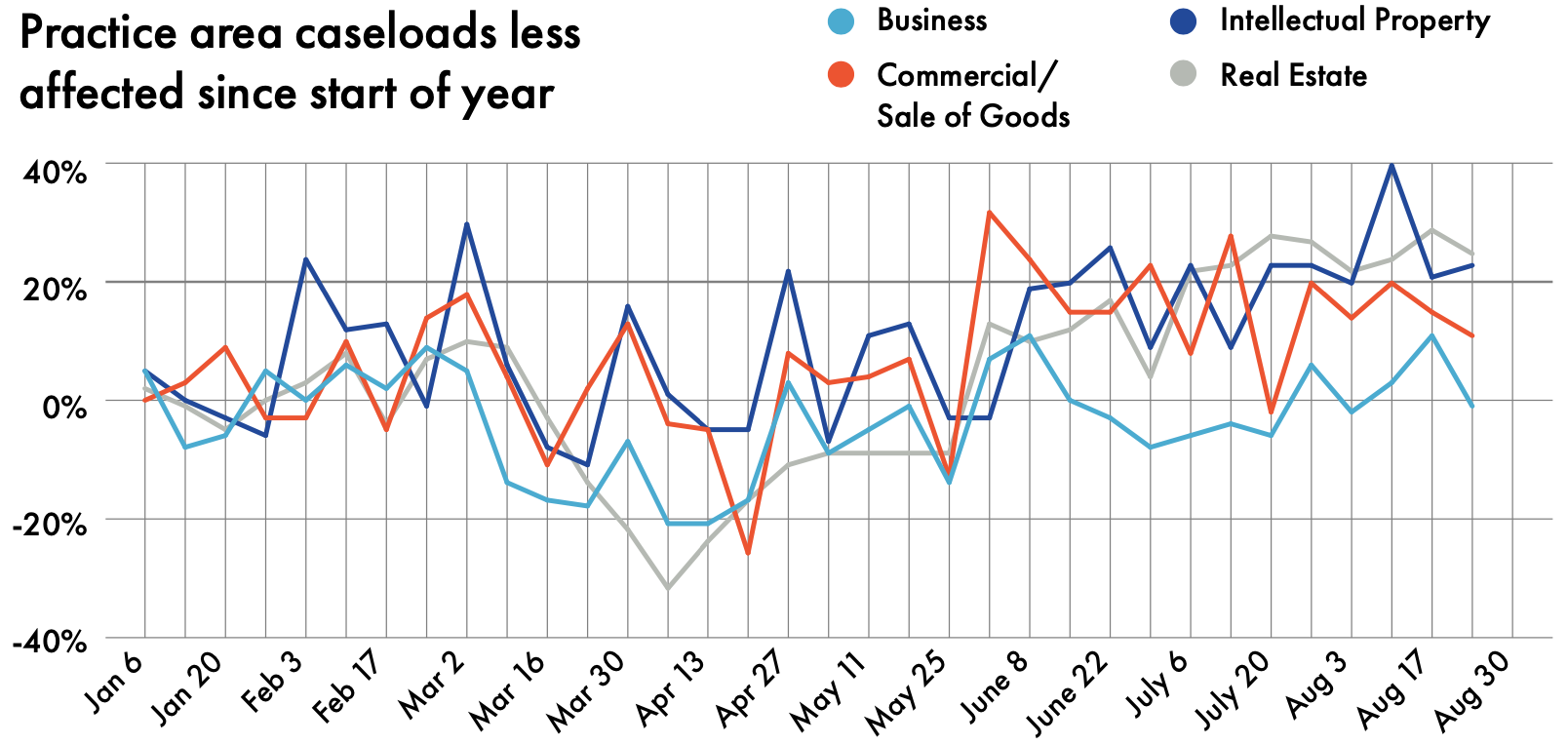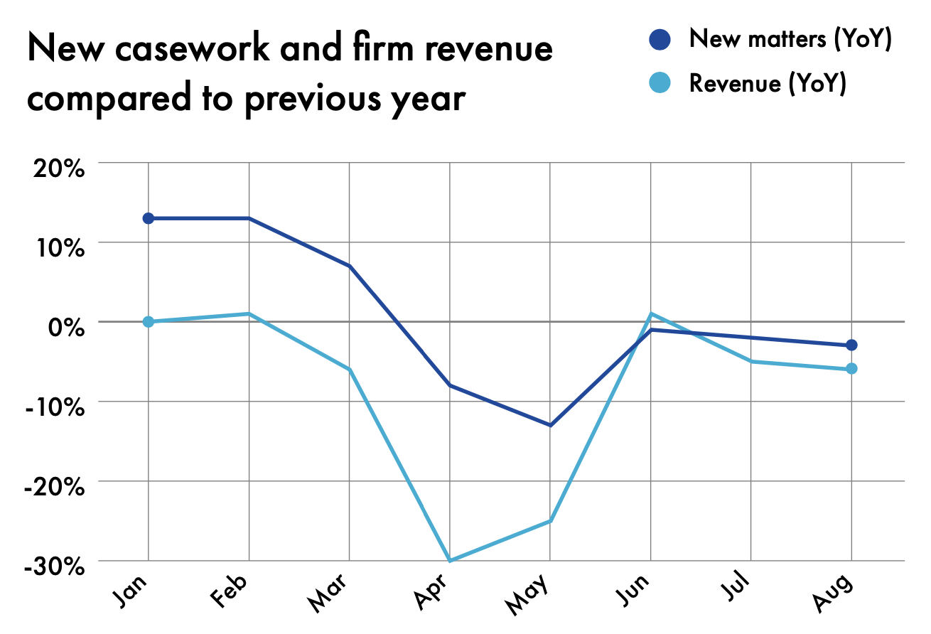 There’s a wealth of information in this year’s report, especially when it comes to technological adoption, but let’s face it: the most salient takeaway in a year like 2020 is the overall health of the industry. We checked in with CEO Jack Newton back in June when Clio’s data first suggested that the legal profession might be turning the corner. While the June highs may have receded a bit, it does appear as though matters have stabilized.