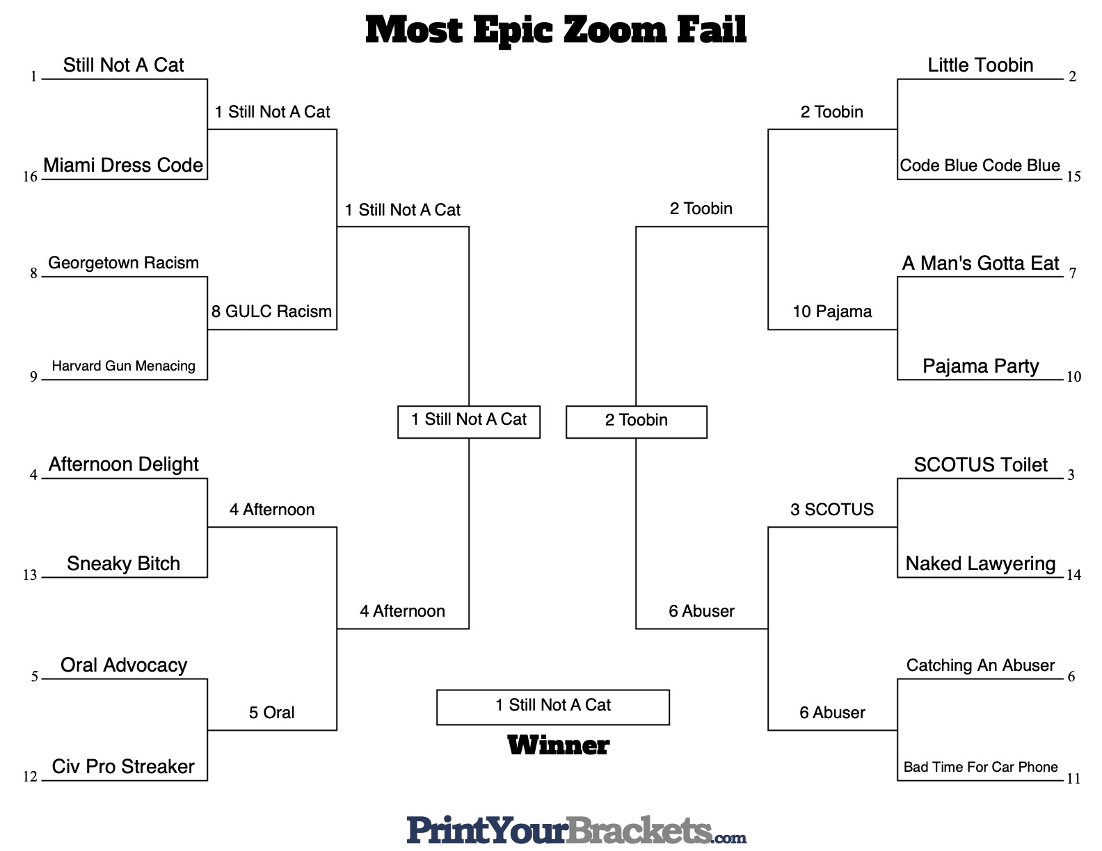 We’ve had quite a journey through this bracket challenge. In the end, we only had two upsets throughout the entire tournament, which is a credit to my brilliant seeding, thank you very much. But all good things must come to an end, and now we’re ready to crown the most epic Zoom fail of the legal pandemic according to our readers.